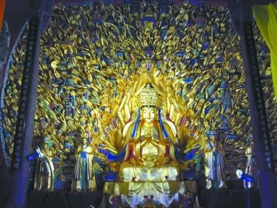 大足石刻千手觀音造像高7.7米、寬12.5米,開鑿于距今800多年的南宋年間,是中國(guó)最大的集雕刻、彩繪、貼金于一體的摩崖石刻造像,也是世界文化遺產(chǎn)大足石刻的代表作品之一。