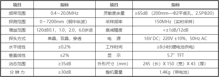 - 缺陷回波參數(shù)(距離、垂直、水平、波幅、dB或當(dāng)量孔徑值)實(shí)時(shí)顯示;多次波探測(cè)缺陷的實(shí)際深度可直接顯示。