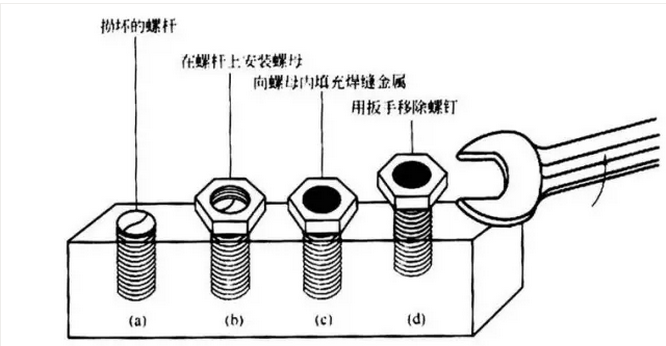② 如果螺釘槽、螺母或牙槽損壞或丟失,可以在螺釘頭的上部(或殘余部分)放置一個(gè)螺母,旋緊螺母,然后采用任何焊接方法在螺母和螺釘?shù)膬?nèi)部填充金屬。這樣就會(huì)將螺母和螺釘殘余部分連接起來(lái),然后在螺母上放置扳手或牙鉗,迅速拔出螺釘。采用這種方法有利于提供一個(gè)新的握力點(diǎn)并可利用熱量使螺釘緊固,用焊接方法移除固定螺釘?shù)臍堄嗖糠质疽馊鐖D4所示。