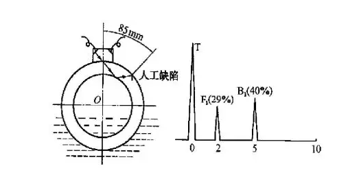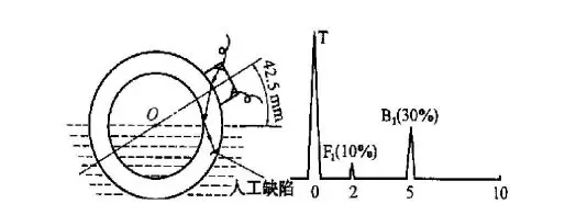 (3) 繼續(xù)旋轉(zhuǎn)樣管將人工缺陷完全浸入水中,此時(shí)探頭中心線距水面周向距離為42.5mm,波幅變化情況如圖6所示。可見,B1與上種情況相同,為滿幅的30%,F(xiàn)1則降至滿幅的10%(-9.5dB),B1和F1均比原始狀態(tài)衰減9.5dB,由此可以看出水浸探傷能量衰減的嚴(yán)重程度。若樣管完全被水浸 沒,能量衰減會(huì)更加嚴(yán)重。