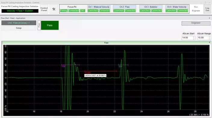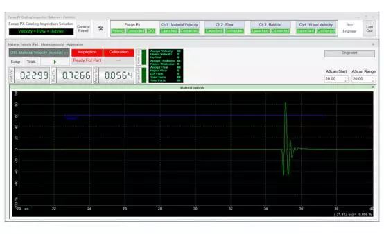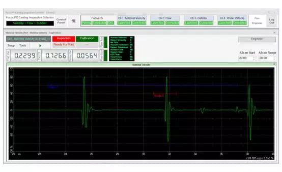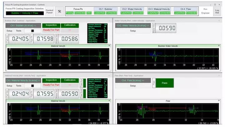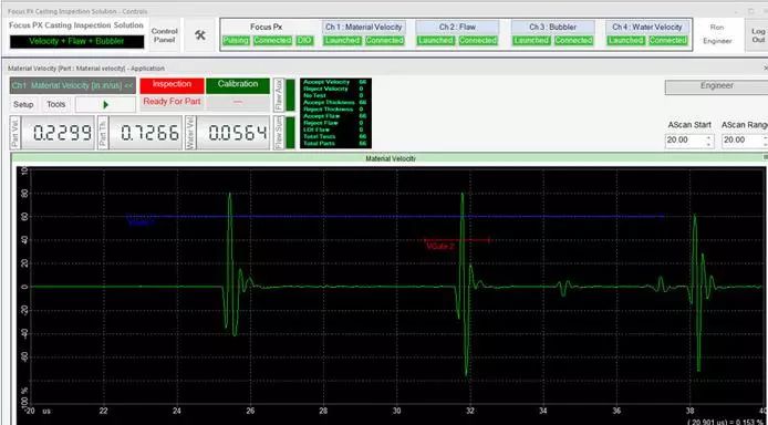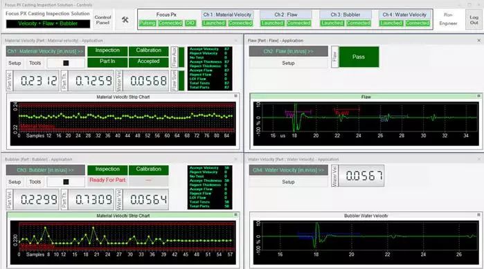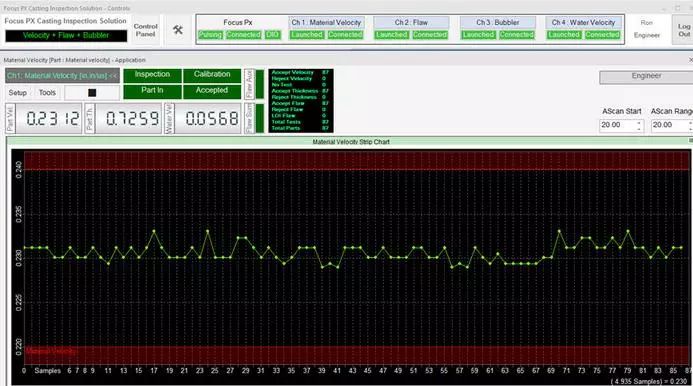 在檢測期間,可以通過用戶界面上的LED屏幕觀察檢測順序。接受/拒絕排序決定也會顯示在LED屏幕上,并在數(shù)字輸入/輸出總線上發(fā)出信號,顯示每個檢測鑄件的速度數(shù)值、厚度和水中聲速測量結(jié)果等信息。每個鑄件的測量值都會繪制在趨勢圖上。接受的和拒絕的零件數(shù)以及檢測的總零件數(shù)由用戶界面上的零件計數(shù)器進(jìn)行計數(shù)和顯示。檢測結(jié)果最終可導(dǎo)出為CSV文件,用于離線文檔存儲和分析。