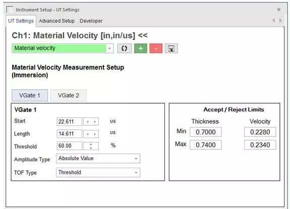 在超聲波檢測系統(tǒng)軟件界面設(shè)置檢測樣品的聲速和厚度極限值